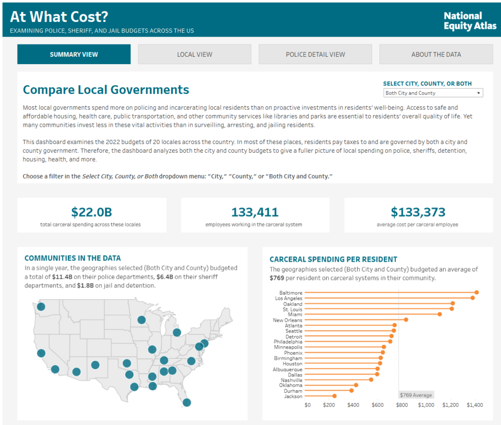 Civiliytics is excited to announce the release of At What Cost? Examining Police, Sheriff, and Jail Budgets Across the US — a new data tool we developed in partnership with the National Equity Atlas (a research partnership between PolicyLink and the USC Equity Research Institute). The interactive dashboard explores how much cities and counties across the United States spend on policing and incarceration.