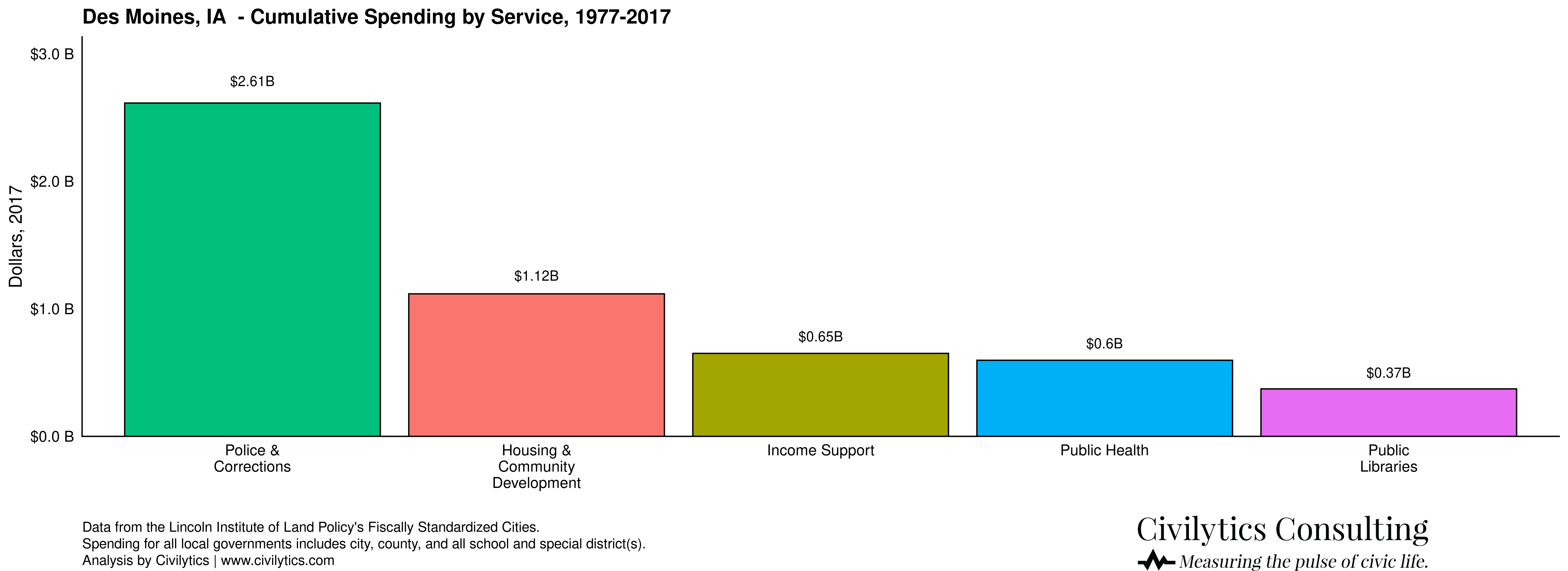 Des Moines’ discretionary budget is like that of a lot of cities we have looked at – police and fire spending are big line items, most spending is on staff (salaries and benefits), and many local social services (housing, education, food security) are funded by outside sources with limited city government funding.